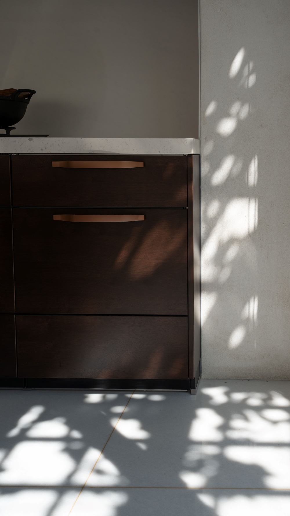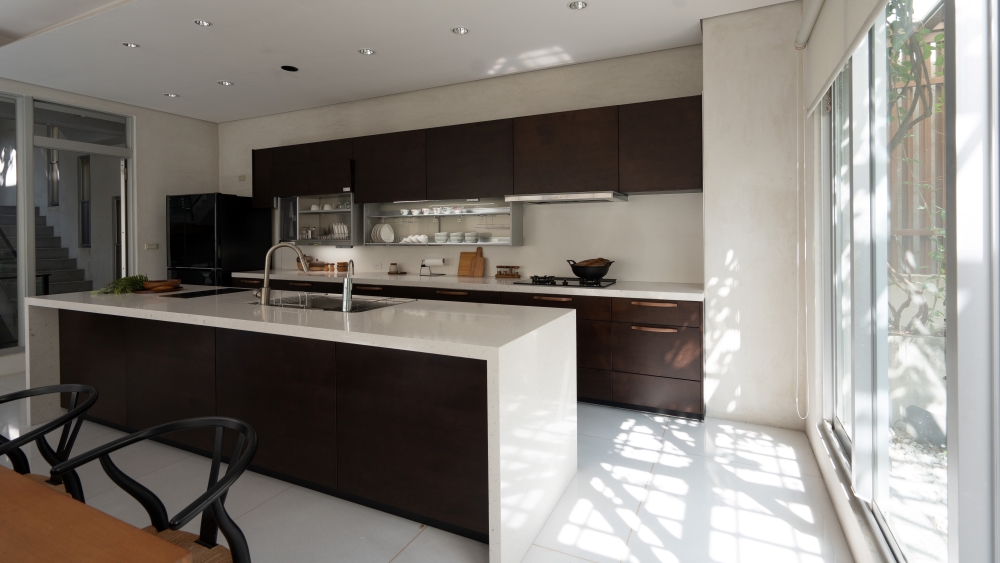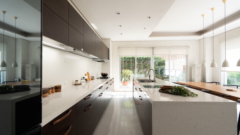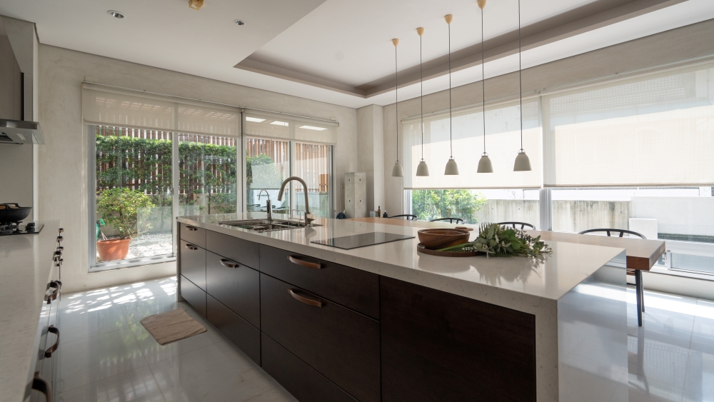 (德匠名廚)臺南東興展示中心-王子元設計師 表示:屋主現場採光良好,選用實木貼皮門片來讓自然光線與實木貼皮的光影效果得到極大的昇華及提升。水槽設計於中島,來提升後方檯面空間,以便屋主擺放小家電,上方改採用電動升降櫃來幫助收納的便利性。