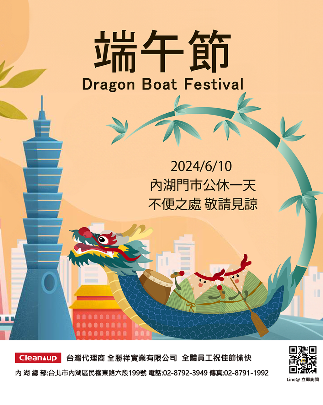端午佳節即將來臨,我們的內湖門市將於端午節(6月10日星期一)公休一天。 6月11日星期二我們將恢復正常營業,期待您的光臨! 感謝您的理解與支持,祝大家端午節快樂!