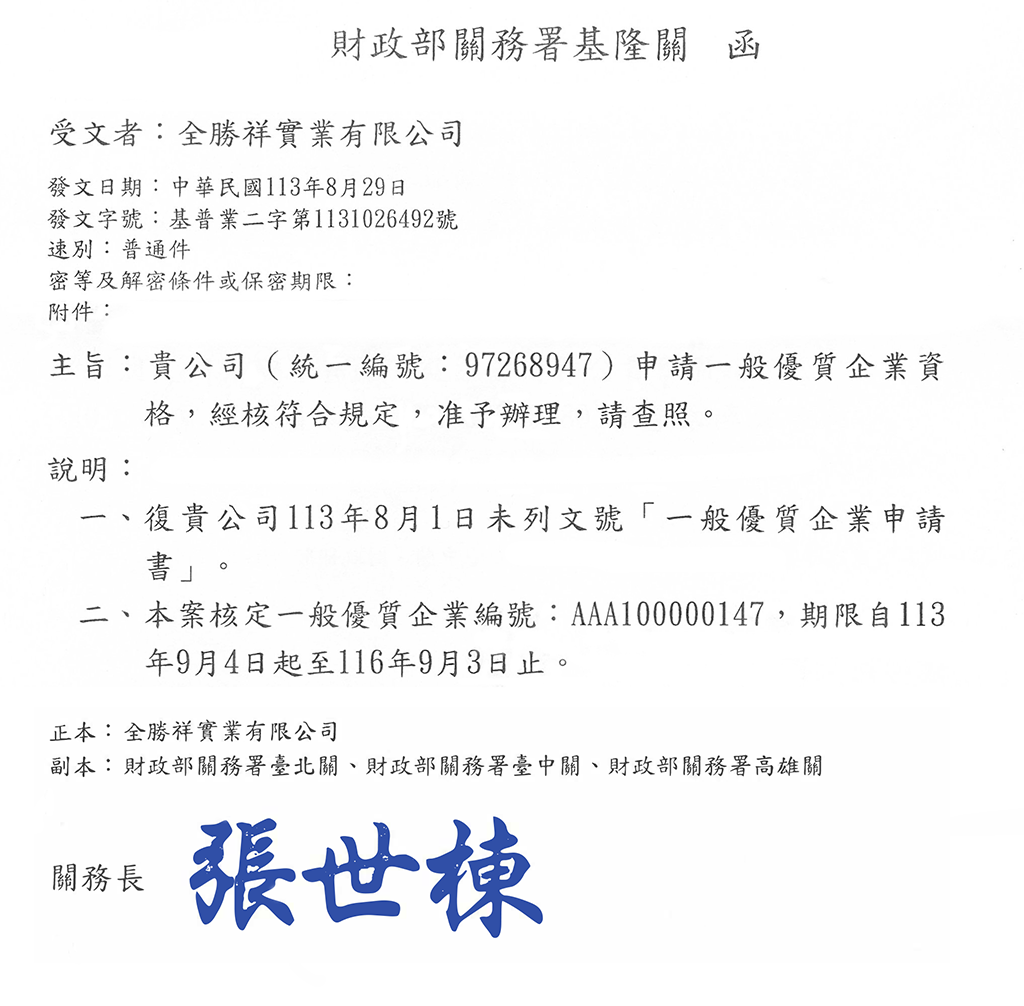 全勝祥實業榮獲財政部關務署的優質企業認證,這對我們來說是一個大大的肯定! 我們一直堅持誠信經營,確保產品品質過關,並努力提供更好的服務。 這份榮譽不僅讓我們感到驕傲,也讓我們更有動力繼續前進、再創高峰!