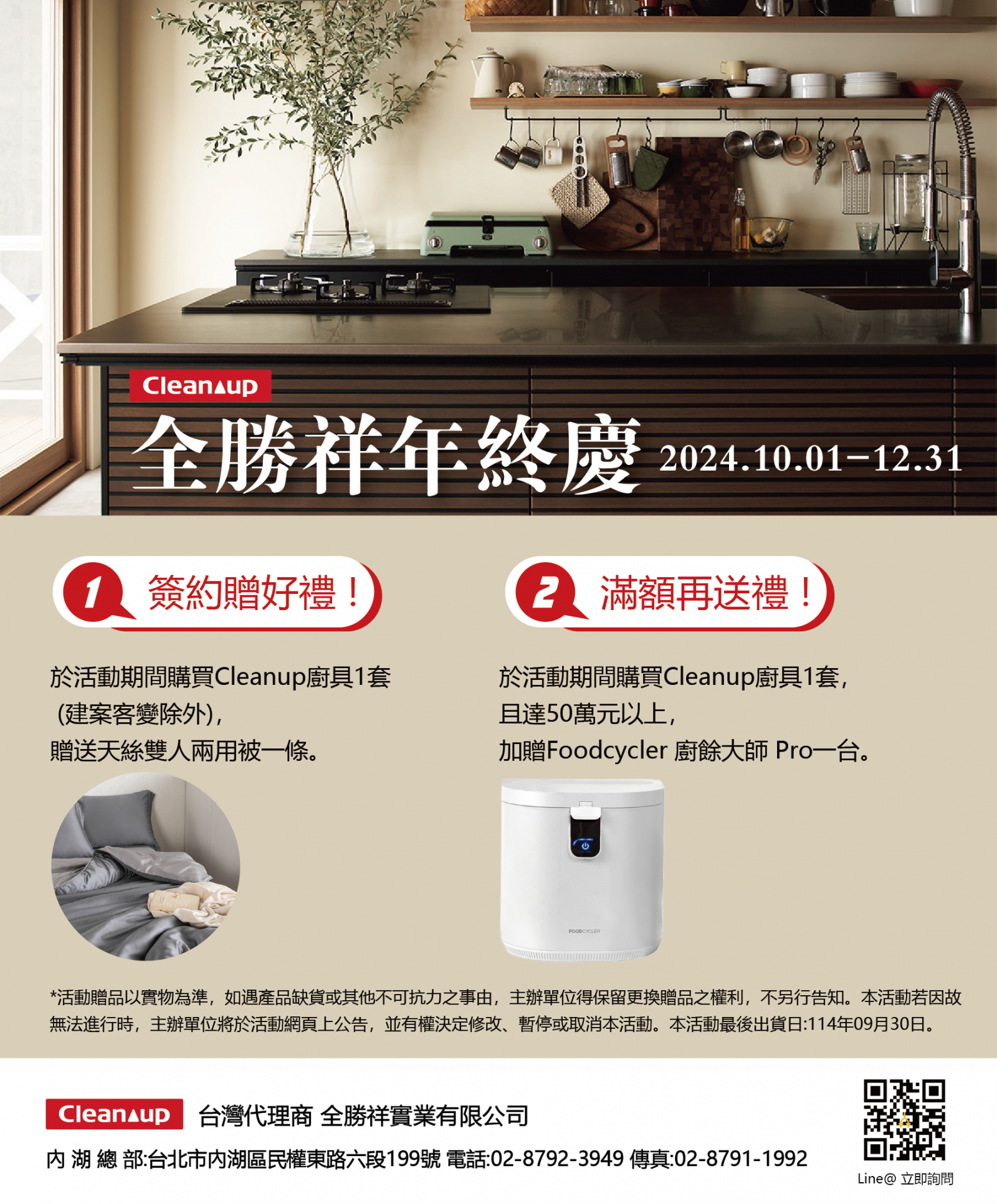 全勝祥年終慶開跑! 只要在活動期間購買1套 Cleanup 廚具(建案客變除外),就能免費帶回天絲雙人兩用被一條,讓你享受舒適好眠! 還有滿額再送禮的驚喜!只要購買 Cleanup 廚具達50萬元以上,再加贈 Foodcycler 廚餘大師 Pro 一台,讓你在家輕鬆處理廚餘,生活更環保 趕快來搶好康吧! (贈品數量有限,以實物為準,如遇缺貨或不可抗力,主辦單位保留更換權利,詳情請上Facebook粉絲頁查看) 活動贈品最晚出貨日:114年09月30日 即刻預約現場專人導覽:02-8792-3949 LINE@QR code https://lin.ee/LgBdoiu 地址:台北市內湖區民權東路六段199號