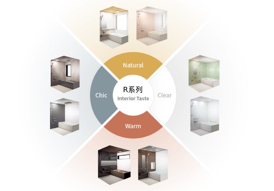 享受「喜歡」。 精心嚴選的室內裝飾、讓「喜歡」包圍你的沐浴時光。 壁板、天井板以及浴缸側板相互搭配整體顏色及材質。 選擇您喜愛的功能與配件,只專屬您的整體衛浴就此誕生。