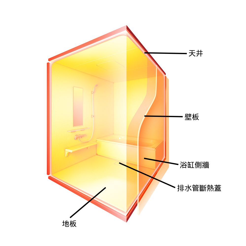 從天井板、壁板到地板內側的整個浴室都包覆著保溫才。