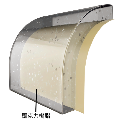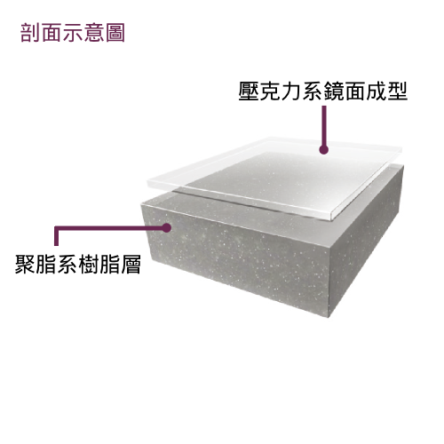 重點: 在漂亮花色的聚脂系樹脂上覆蓋上一層壓克力系的鏡面加工。