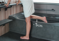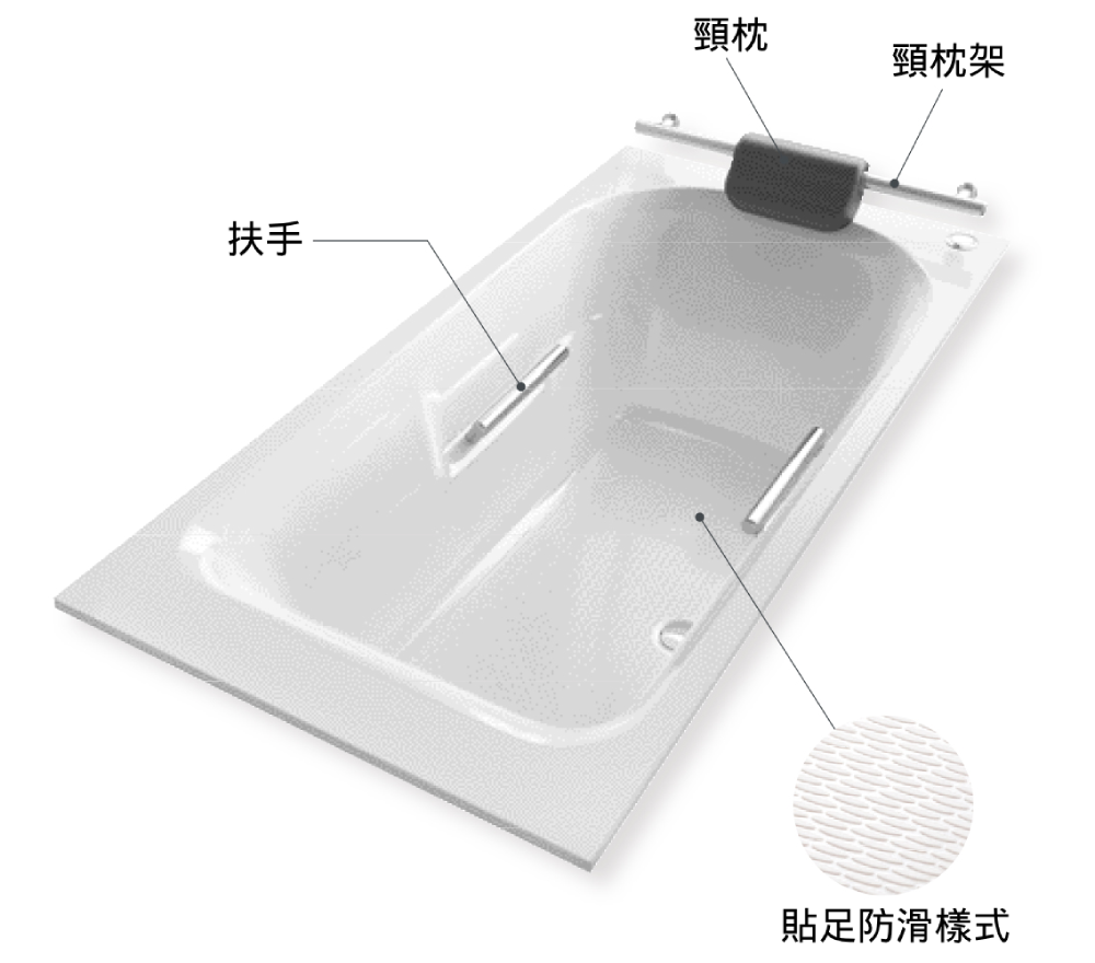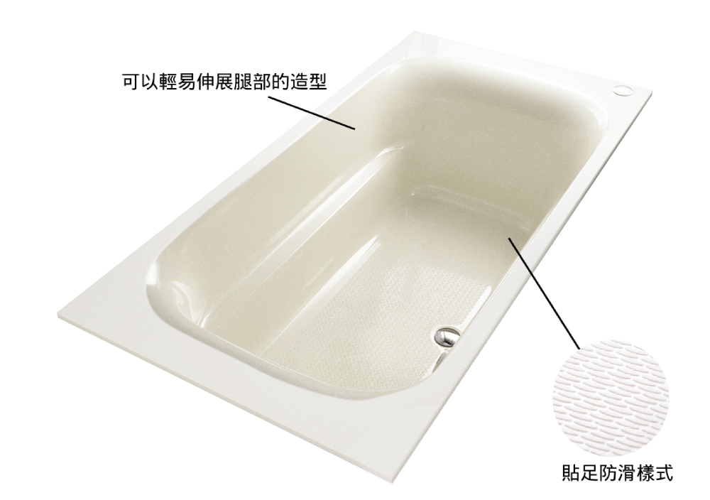 | 橫跨出浴缸的部分較低較薄,因此比較好出入;浴缸側邊的中央高度比兩邊低了5cm。 | 地板與浴缸內側的底部高低差較少,可以站得比較穩。 | |||||||||
