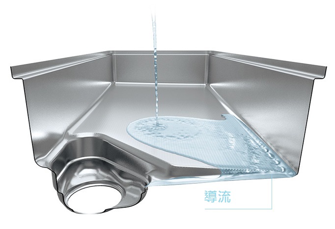 可將殘渣或髒汙聚集至前方的「導流槽」並被水流帶到排水口。
