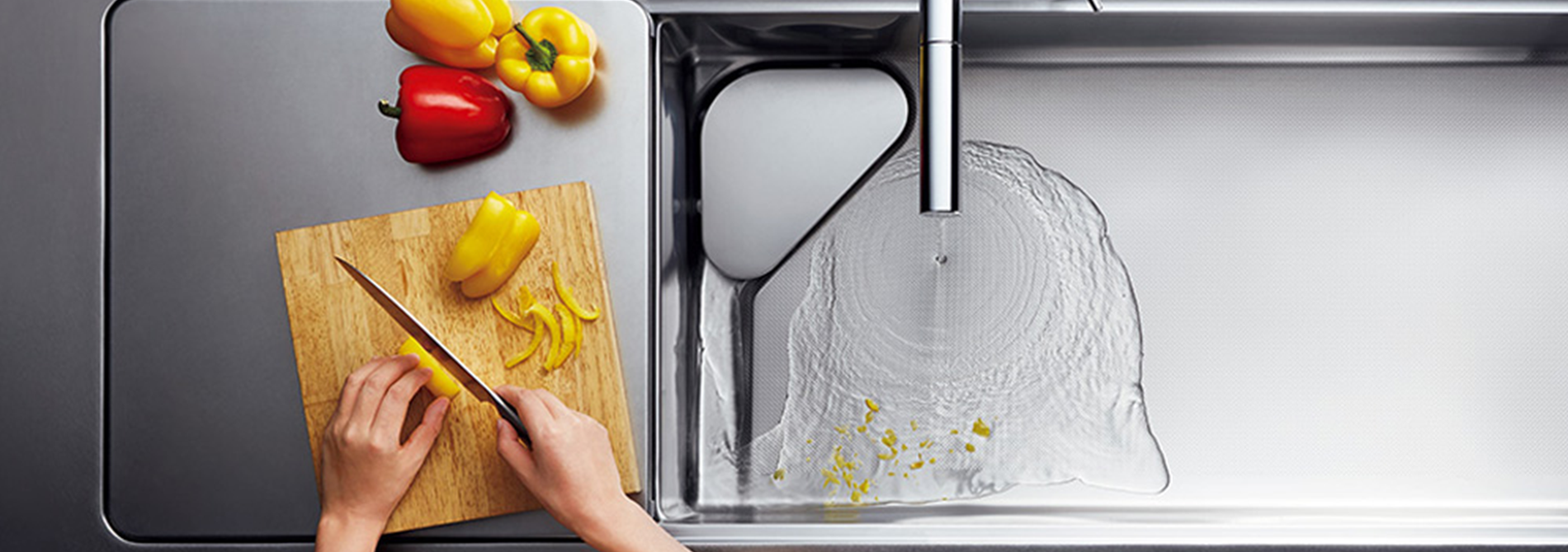 料理洗菜時或收拾洗餐盤時的水力,會將水槽中的殘渣不停往排水口方向沖。