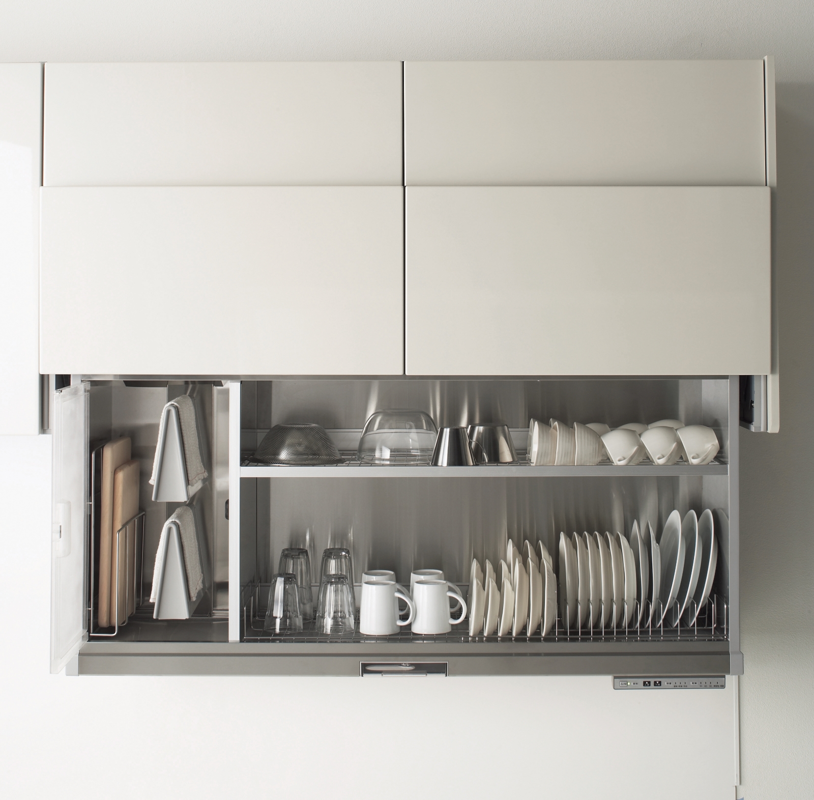 抹布砧板可至於除菌室以熱風殺菌,洗好的碗盤可直接放置於右側乾燥庫中。