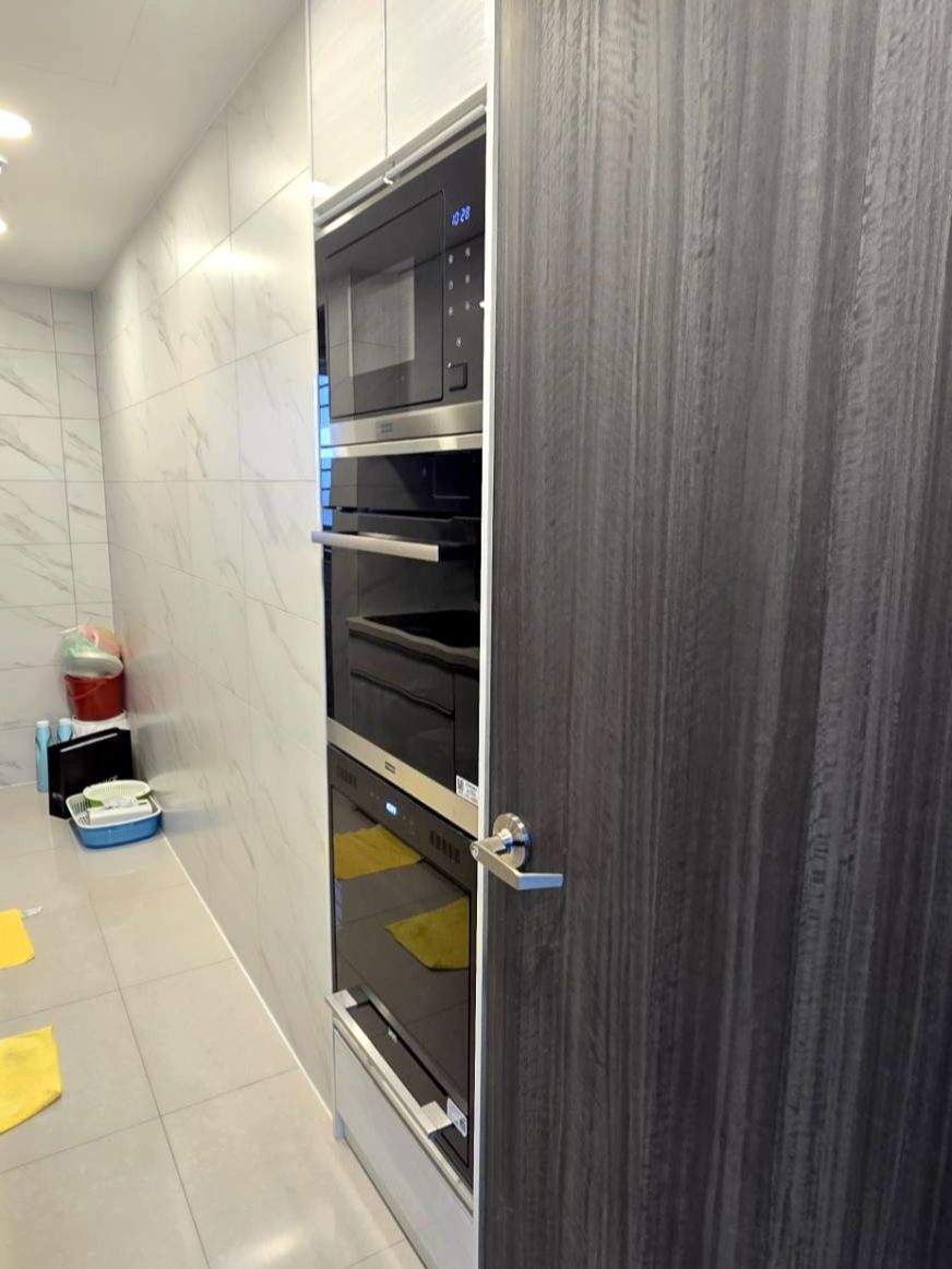 設計師選用 Cleanup STEDIA Class03 CHK 色門片,其細膩的灰白木質紋理,讓廚房空間充滿溫潤質感,搭配凱薩金石棉白色檯面,營造出和諧的層次感,銀色的隱藏式把手設計更是神來一筆,不僅簡潔俐落,也讓整體風格更顯純粹,與整體廚房牆壁與地板相呼輝映。