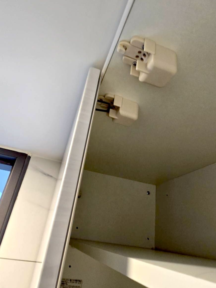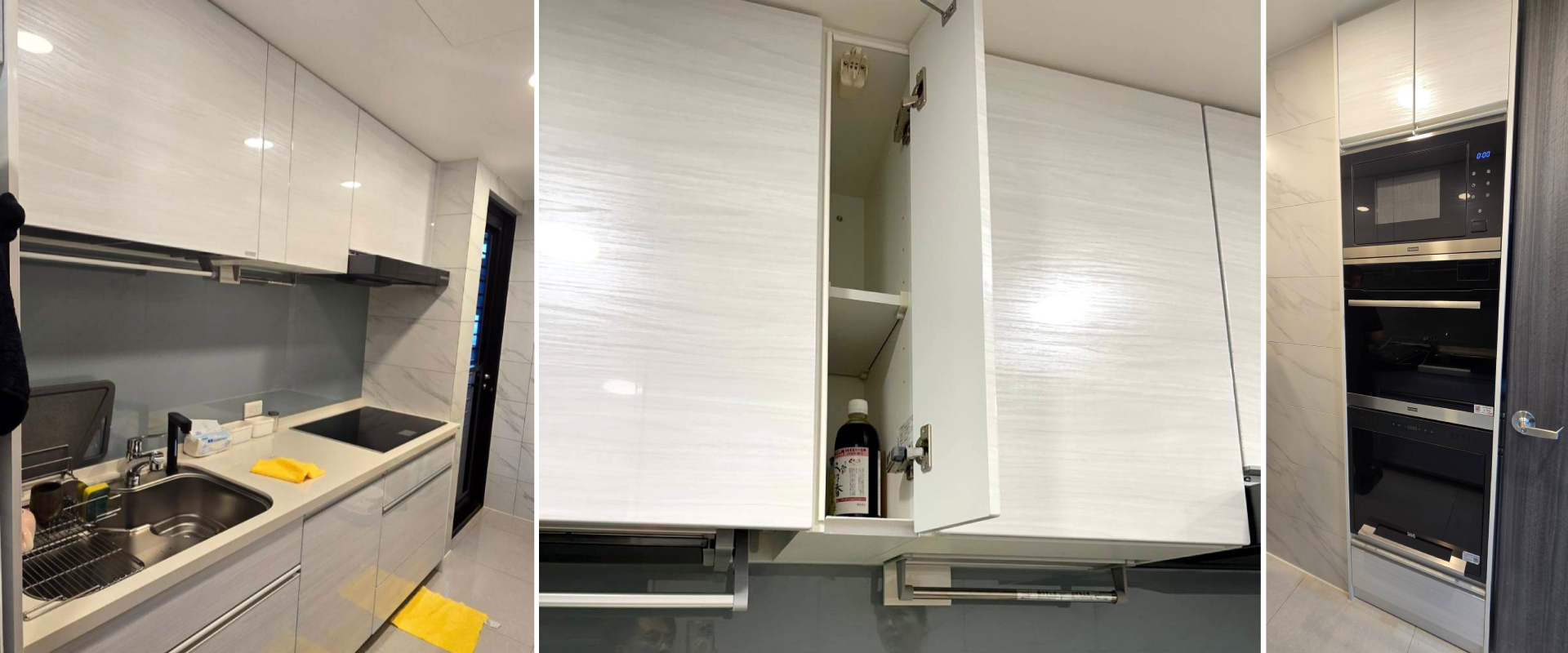 設計重點 設計師選用 Cleanup STEDIA Class03 CHK 色門片,其細膩的灰白木質紋理,讓廚房空間充滿溫潤質感,搭配凱薩金石棉白色檯面,營造出和諧的層次感,銀色的隱藏式把手設計更是神來一筆,不僅簡潔俐落,也讓整體風格更顯純粹,與整體廚房牆壁與地板相呼輝映。