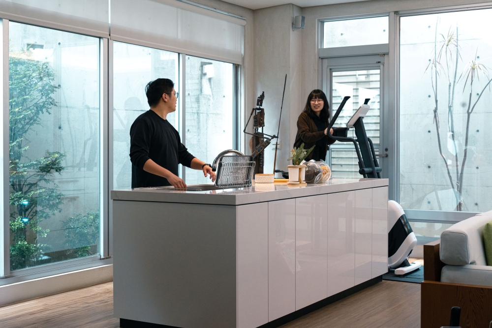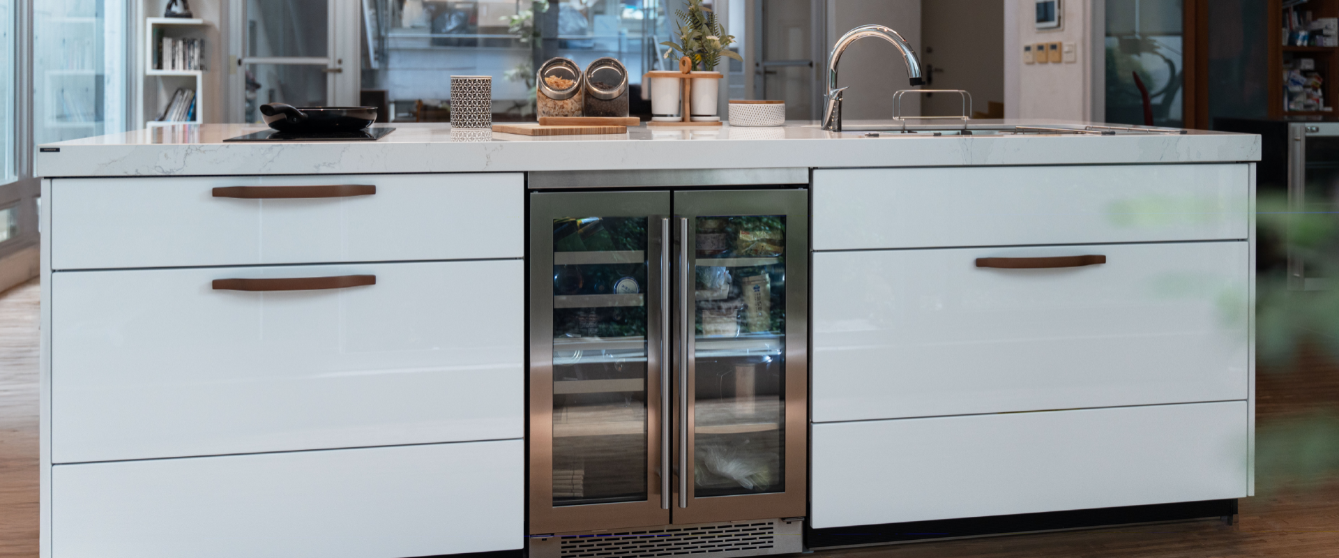 (德匠名廚)臺南東興展示中心-王子元設計師 表示:在沙發正後方的位置,安裝上全家夢想的輕食廚房,採用間單大方CNA白色門片去襯托後方清水模圍牆,讓後院的綠樹與沙發的綠色抱枕相互輝映,讓CNA成為家中的中心,並讓家人料理時能後與運動的家人一同歡樂。中島下方採用紅酒飲料櫃,客廳中的家人無需跑到廚房拿取紅酒飲料,讓空間動線得到最大的運用。
