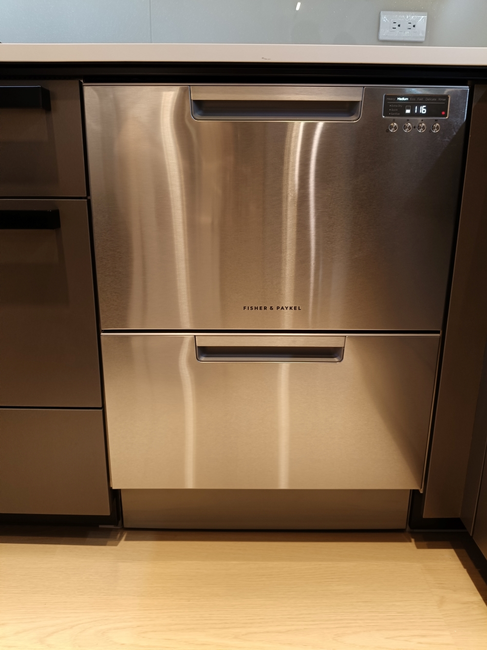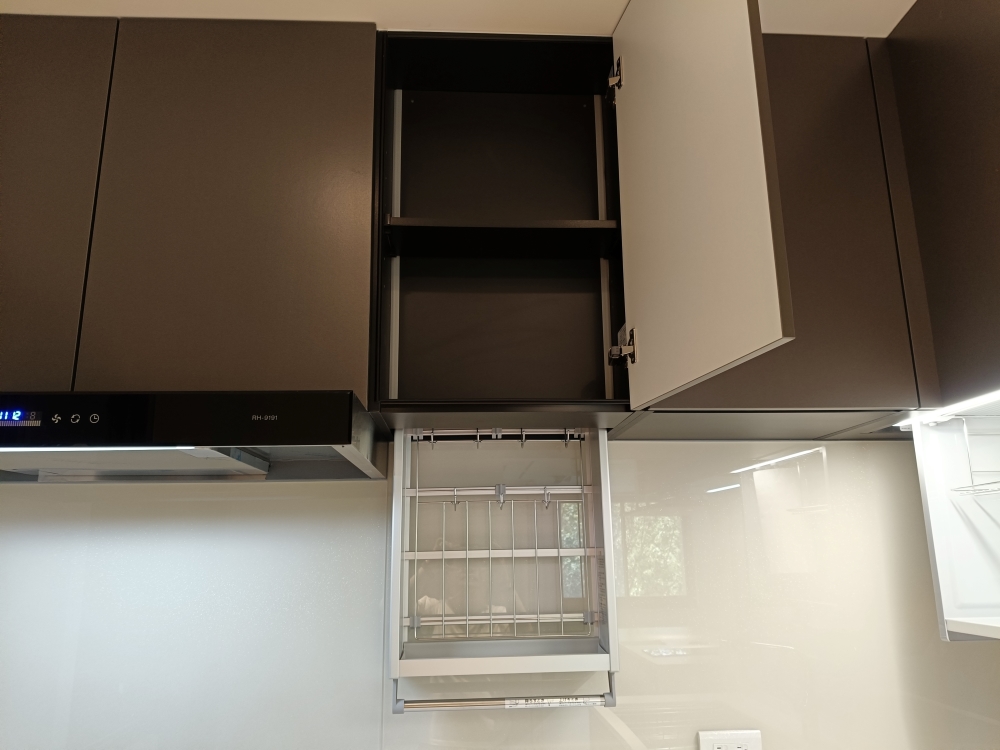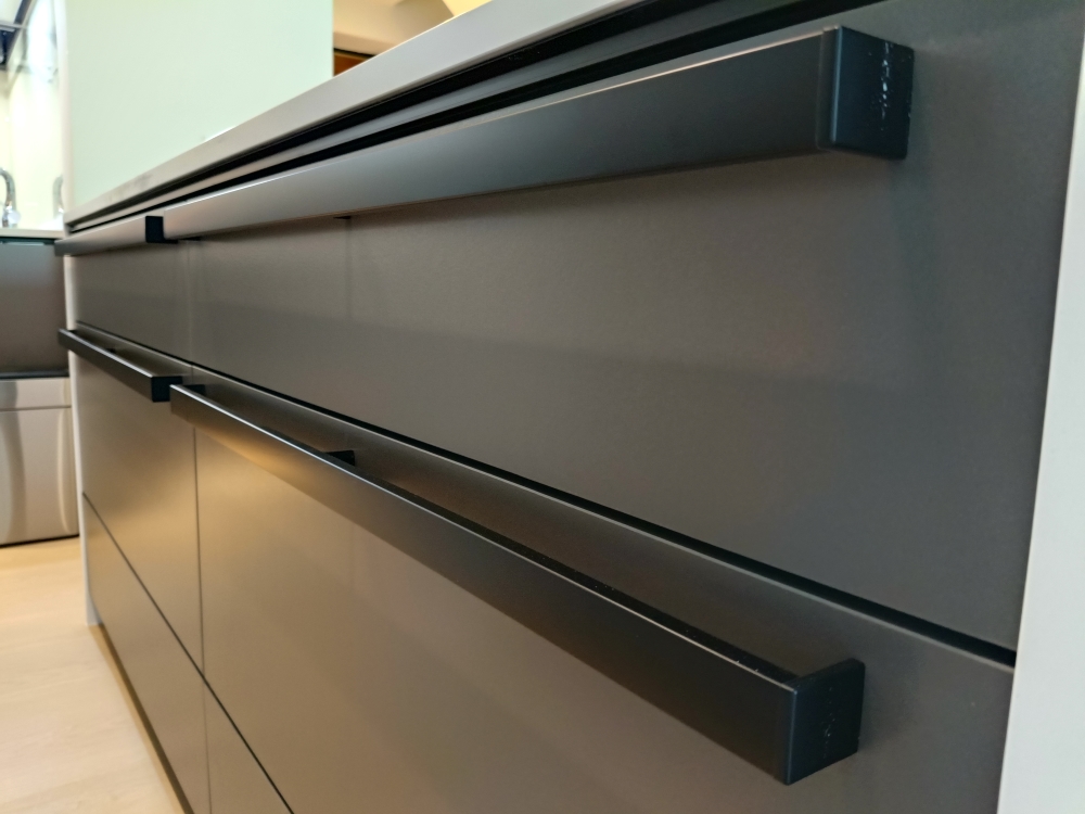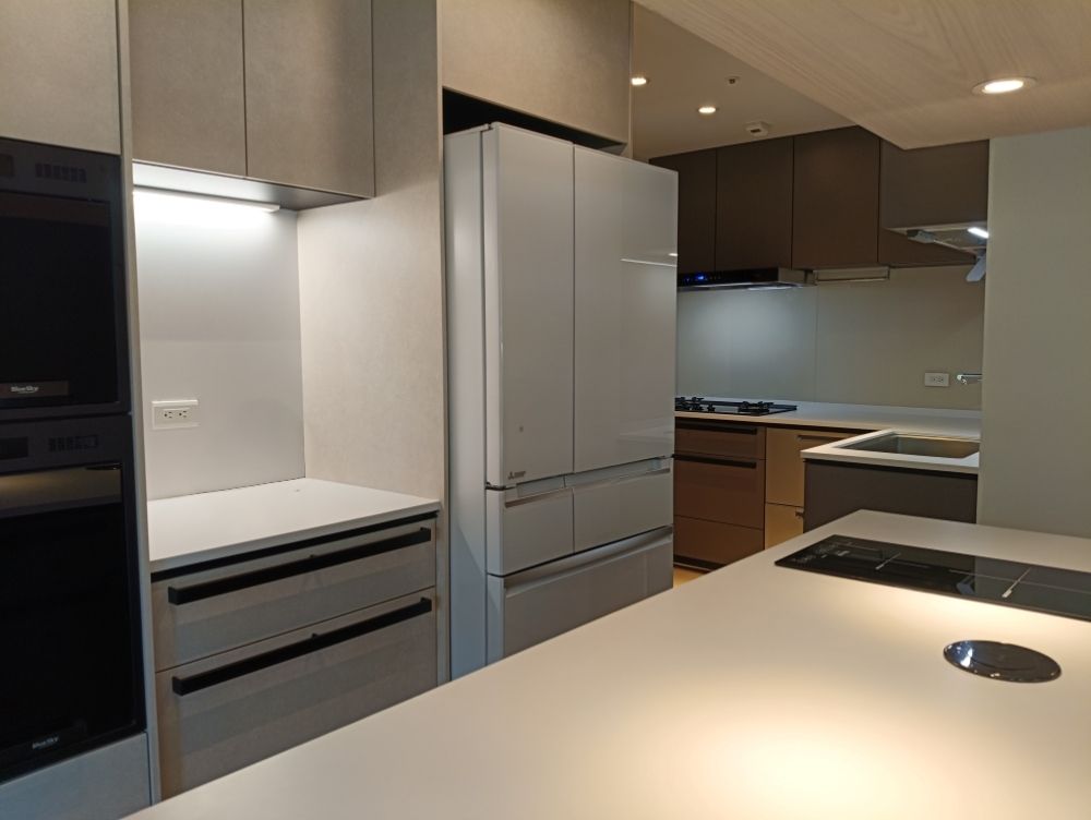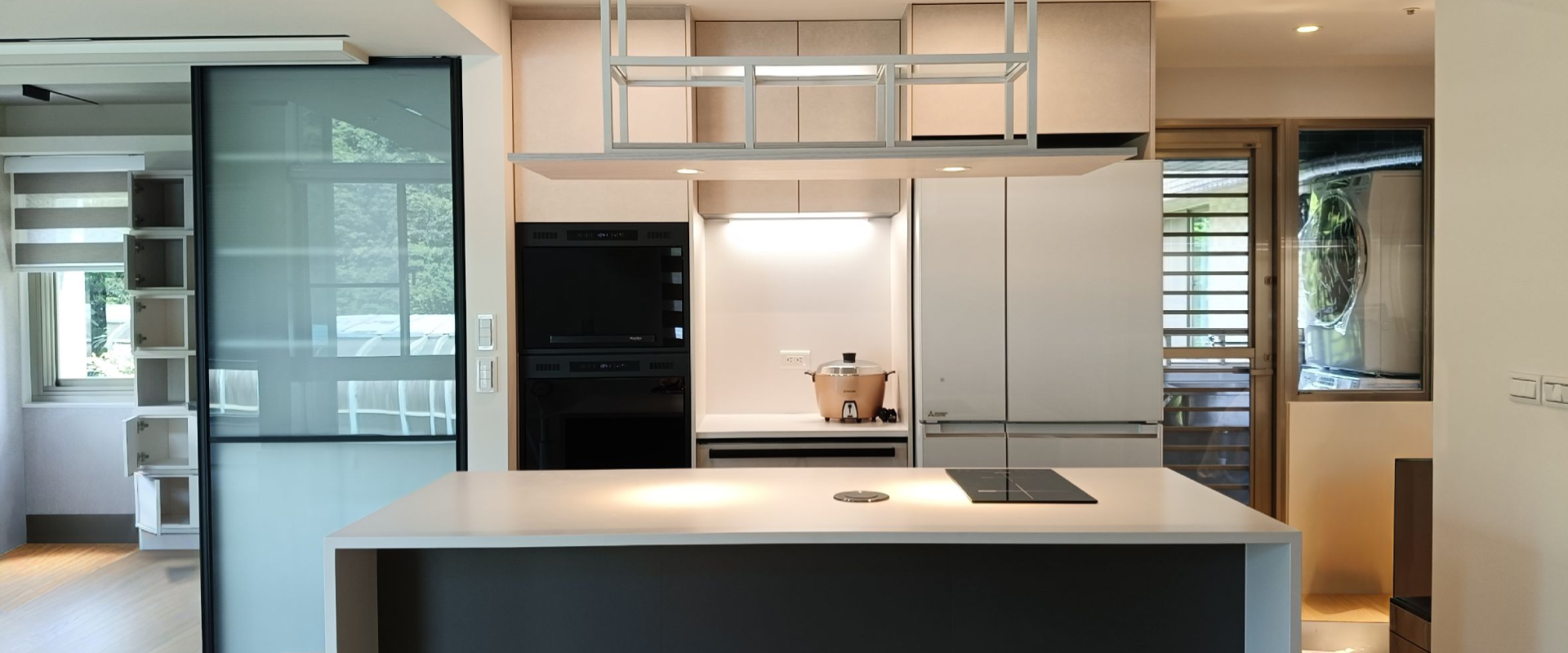 Cleanup小空間的機能美學!設計師以Cleanup CENTRO的CAV與CUL優雅配色,搭配黑色凸把手,營造俐落現代感,開放中島設計結合電器櫃,讓料理動線更順暢;檯面選用賽麗石CS-503,耐刮耐污又具時尚光澤,搭載電動升降烘碗機吊櫃與下拉式吊櫃,還有中島韓國升降插座,巧妙隱藏物品,收納不雜亂一應俱全;加上日本BF導流水槽實用與美感兼具,打造最懂生活的小空間廚房。